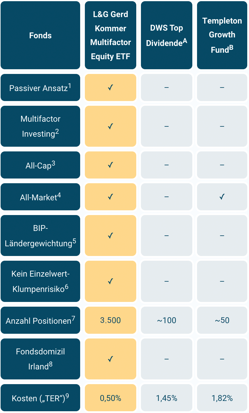 Der L&G Gerd Kommer Multifactor Equity UCITS ETF ist die 1-ETF-Lösung für den risikobehafteten Portfolioteil des Weltportfolio-Konzepts von Gerd Kommer. Damit steht er im direkten Wettbewerb zu anderen ETFs auf die „Welt-AG“, also eine hochdiversifizierte Eigenkapitalbeteiligung am börsennotierten Teil der Weltwirtschaft, wie sie z. B. über den Kauf eines ETFs auf einen MSCI World, MSCI ACWI oder FTSE All-World Index möglich ist.